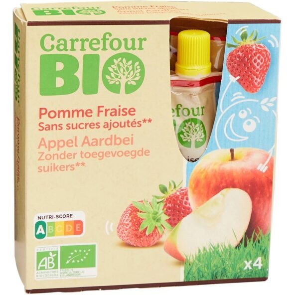 Prepared exclusively from organic apples and strawberries, this fruit dessert contains no added sugars, relying only on the sugars naturally present in the fruit. Carrefour Bio selects high-quality ingredients grown in accordance with organic farming standards, ensuring respect for nature, biodiversity, and sustainable agriculture.