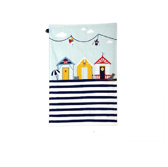 Brighten your kitchen with this charming tea towel with beach huts design. The design shows colourful beach huts in blue, yellow, and red, lined up under a light sky with small hanging flags. A deckchair and an umbrella add a relaxed seaside feel. The bottom half features bold navy and white stripes for a classic coastal look.